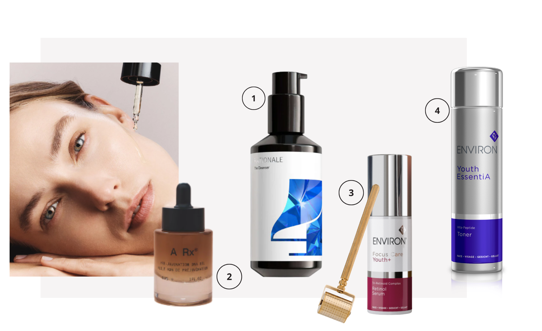 1. Rationale – The Cleanser. 2. Aesthetics Rx – Pre-Juvenation DNA Oil. 3. Environ – Gold Roller + Retinol Serum. 4. Environ. Moisturising Vita Peptide Toner.